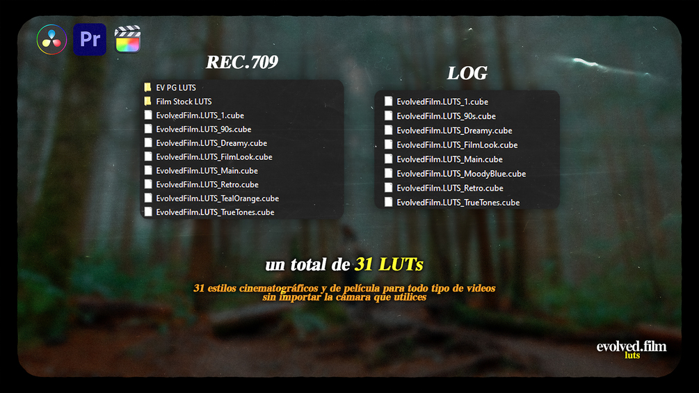- Creados para ser utilzados en softwares de edición de video como Adobe Premiere, Final Cut Pro o cualquier otro programa en el que se puedan aplicar LUTS 3D.